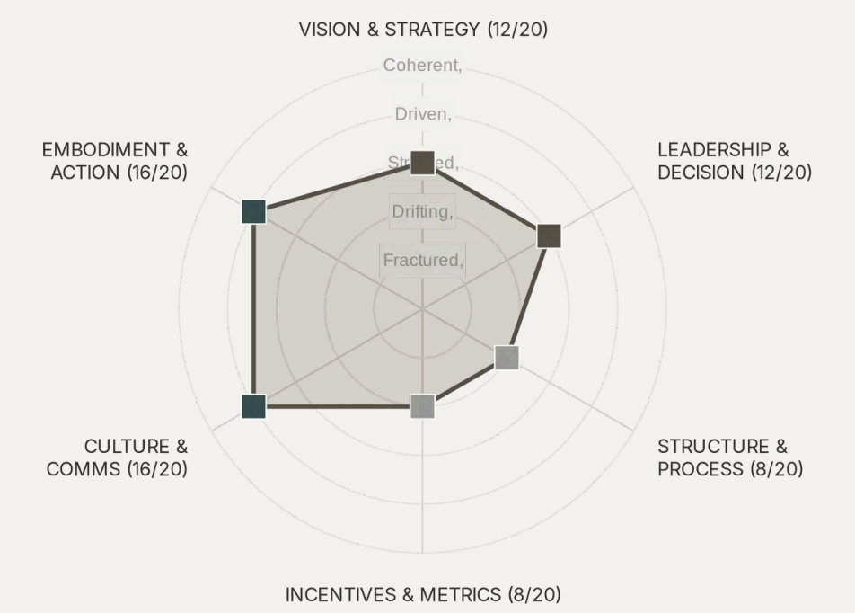 It examines how vision, leadership, structure, incentives, culture, and embodiment interact under load — and where compensation is masking breakdown.